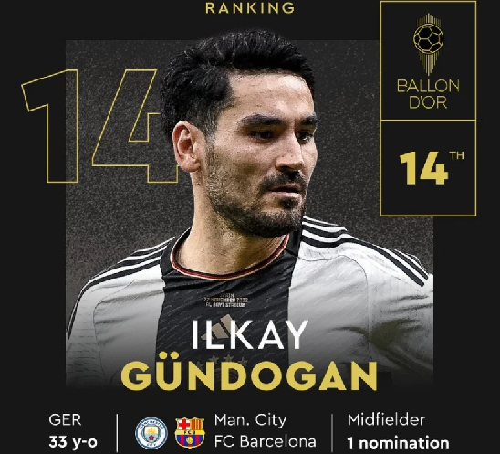 Ilkay Gundogan đứng thứ 14
