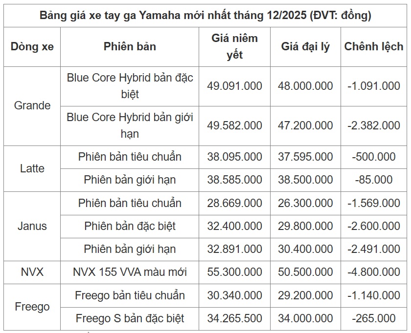 Bảng giá xe máy Yamaha mới nhất tháng 12/2025 tại các đại lý trên cả nước, bảng giá chi tiết nhất được cập nhật trong bài viết dưới đây.