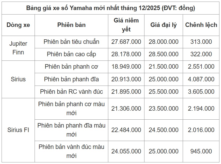 Sau khi khảo sát, giá xe số hãng Yamaha tại các đại lý trong tháng 12 này không có sự biến động mới nào. Giá thực tế cao hơn khoảng 313.000 - 2.194.000 đồng/xe so với giá đề xuất của hãng, giá bán chênh lệch cao nhất được ghi nhận đối với xe Yamaha Sirius FI phiên bản phanh cơ màu mới.