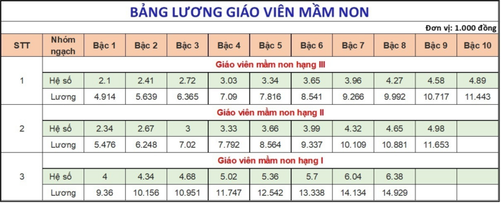 Theo bảng lương mới được áp dụng từ ngày 1/7 (sau khi tăng lương cơ sở từ 1,8 lên 2,34 triệu đồng/tháng), giáo viên mầm non hạng III hiện là nhóm nhận lương thấp nhất, từ khoảng 4,9 đến 11,4 triệu đồng một tháng, tùy bậc (chưa bao gồm phụ cấp, thâm niên).