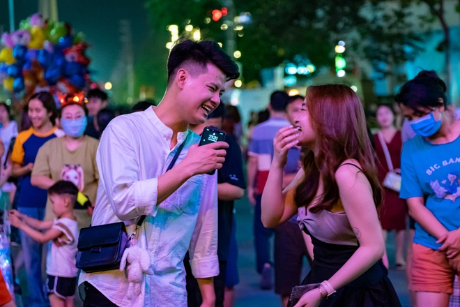 Đôi bạn trẻ hào hứng chờ đợi màn trình diễn gắn liền với mảnh đất Điện Biên như hoa ban, chiếc khăn piêu, chiếc máy bay A321…