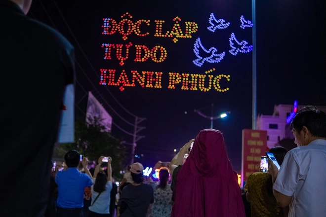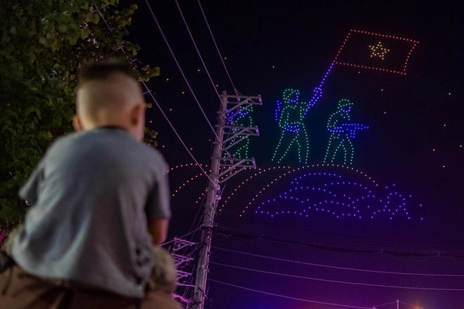 Bầu trời Điện Biên rực rỡ với màn "xếp hình" của 700 drone phát sáng, người dân và du khách thích thú quay lại từng "ngốc ngách"