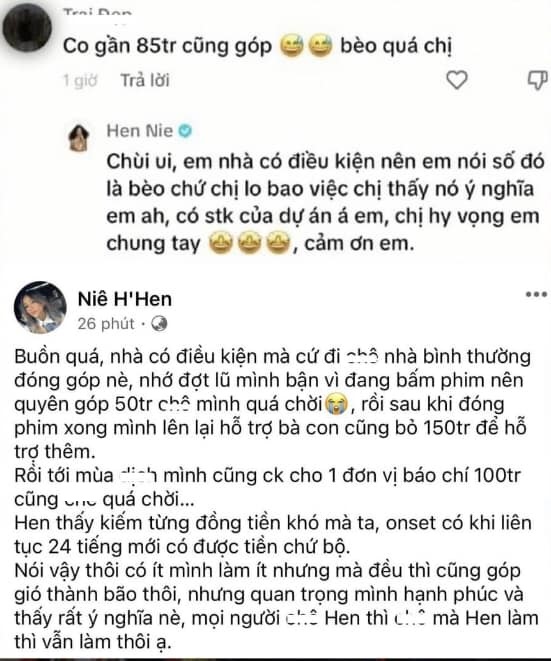 Đồng thời, H'Hen Niê cho biết đây không phải lần đầu cô gặp trường hợp. Trước đó, nàng hậu nhiều lần vướng vào tranh cãi khi công khai số tiền từ thiện, cô chia sẻ: "Buồn quá, nhà có điều kiện mà cứ đi chê nhà bình thường đóng góp nè, nhớ đợt lũ mình bận vì đang bấm phim nên quyên góp 50 triệu chê mình quá trời. Rồi sau khi đóng phim xong mình lên lại hỗ trợ bà con cũng bỏ 150 triệu để hỗ trợ thêm. Rồi tới mùa dịch mình cũng chuyển khoản cho 1 đơn vị báo chí 100 triệu cũng chê quá trời".