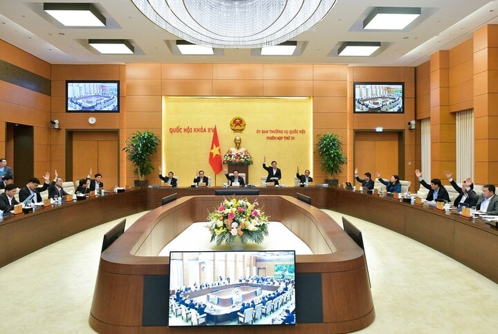 100% các vị Ủy viên Ủy ban Thường vụ Quốc hội có mặt biểu quyết tán thành thông qua các nghị quyết về sắp xếp một số đơn vị hành chính thuộc tỉnh Bình Dương và tỉnh Tiền Giang. (Ảnh: quochoi.vn)