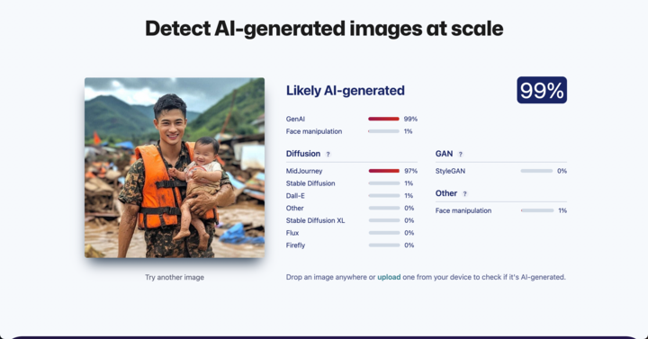 Dù nội dung hình ảnh gợi đến liên tưởng chiến sĩ bộ đội đang giải cứu người dân, đặc biệt là các em nhỏ tại vùng bị ảnh hưởng bởi cơn bão số 3 vừa qua, nhưng đây hoàn toàn là sản phẩm dàn dựng với bàn tay của AI (trí tuệ nhân tạo).