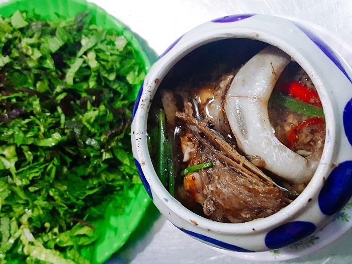Chỉ cần chọn cá rồi làm gia vị ăn kèm gồm: Một tô nước chanh vắt sẵn, lon đậu phộng rang, một rổ rau thơm nhiều loại như húng, tía tô, ngổ, ngò gai, bắp chuối thái nhỏ, cà chua, chuối chát, khế cùng một chén mắm gừng giã nhỏ keo, một đĩa ớt rừng xanh và bánh tráng nướng.