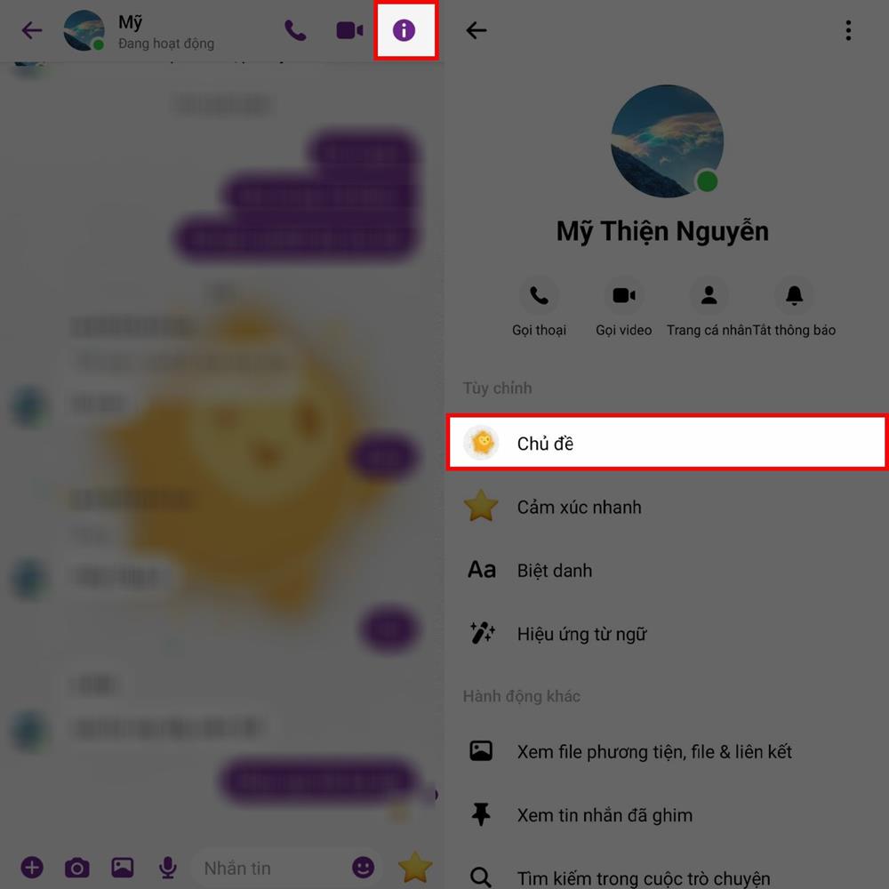 Bước 2: Quá trình cập nhật ứng dụng trên điện thoại của bạn đã xong chưa? Nếu xong rồi thì hãy mở ứng dụng lên và chọn vào cuộc trò chuyện mà mình cần đổi chủ đề. Sau đó truy cập vào menu cuộc trò chuyện, bạn có thể ấn vào biểu tượng chữ i ở góc trên bên phải màn hình hoặc ấn vào tên người trò chuyện của bạn đều được nha. Tại đây, hãy kéo xuống bên dưới một xíu và chọn ngay cho mình mục Chủ đề.