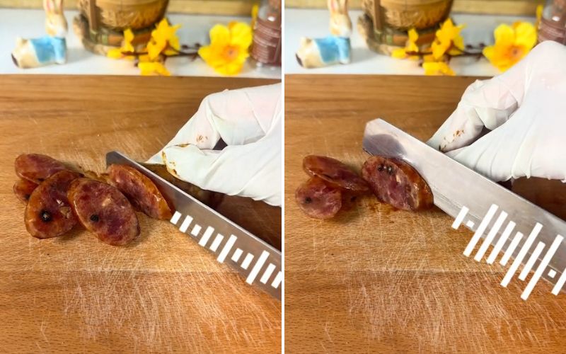Khi bạn thấy nước dừa sắp kẹo lại, bạn tắt lửa rồi dùng đũa đảo đều để lạp xưởng có được màu vàng nâu đẹp mắt. Cắt lạp xưởng thành lát mỏng là có thể dùng được ngay.