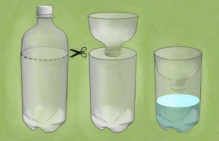 Cách này bạn sử dụng lại những chai nhựa cũ, bạn cắt một phần ba chai nhựa, quay đầu chai nhựa xuống dưới đáy. Tiếp theo, bạn cho một ít đường và nửa quả chuối dưới đáy chai, ruồi rất dễ bị thu hút bởi hôn hợp này và dễ dàng bị sa bẫy.