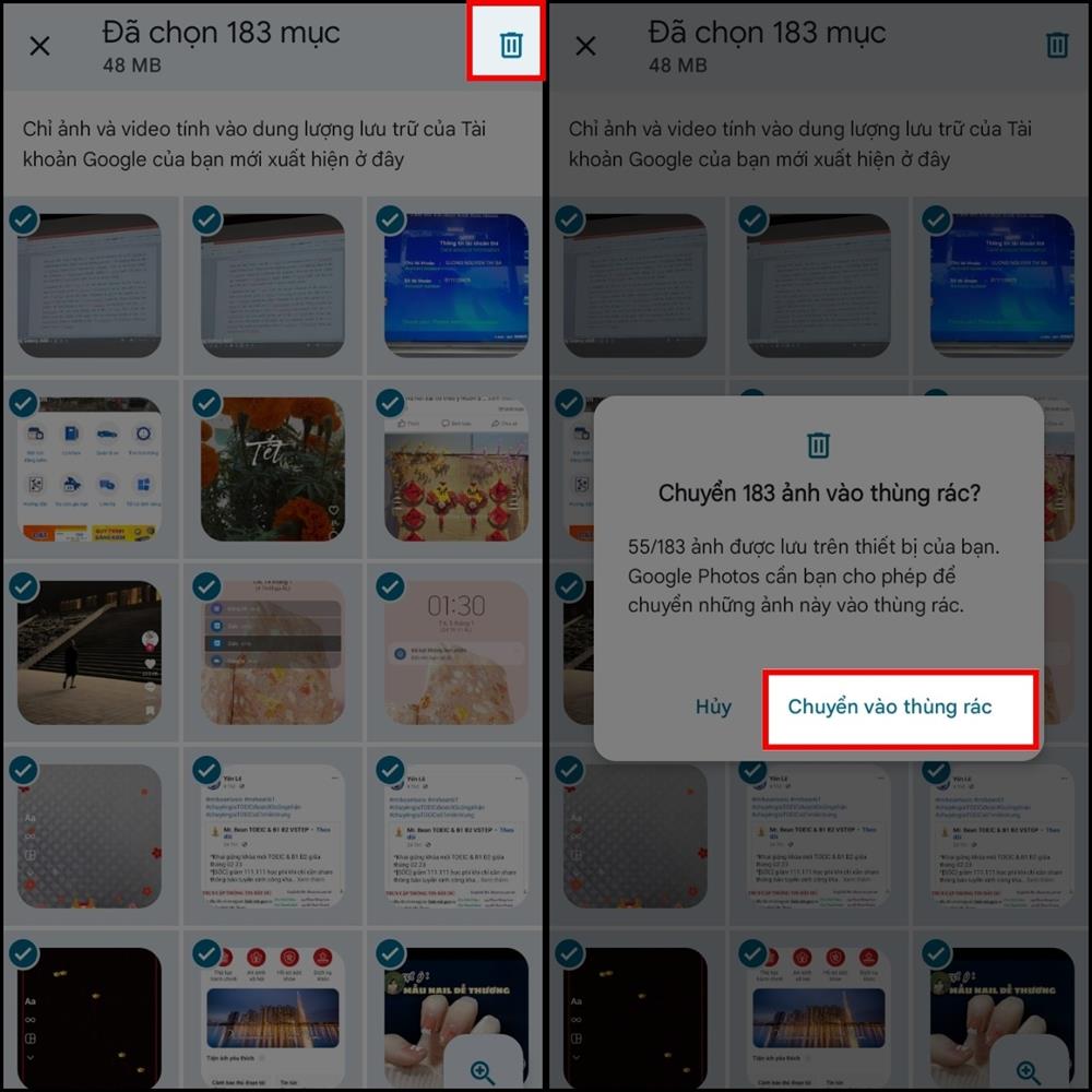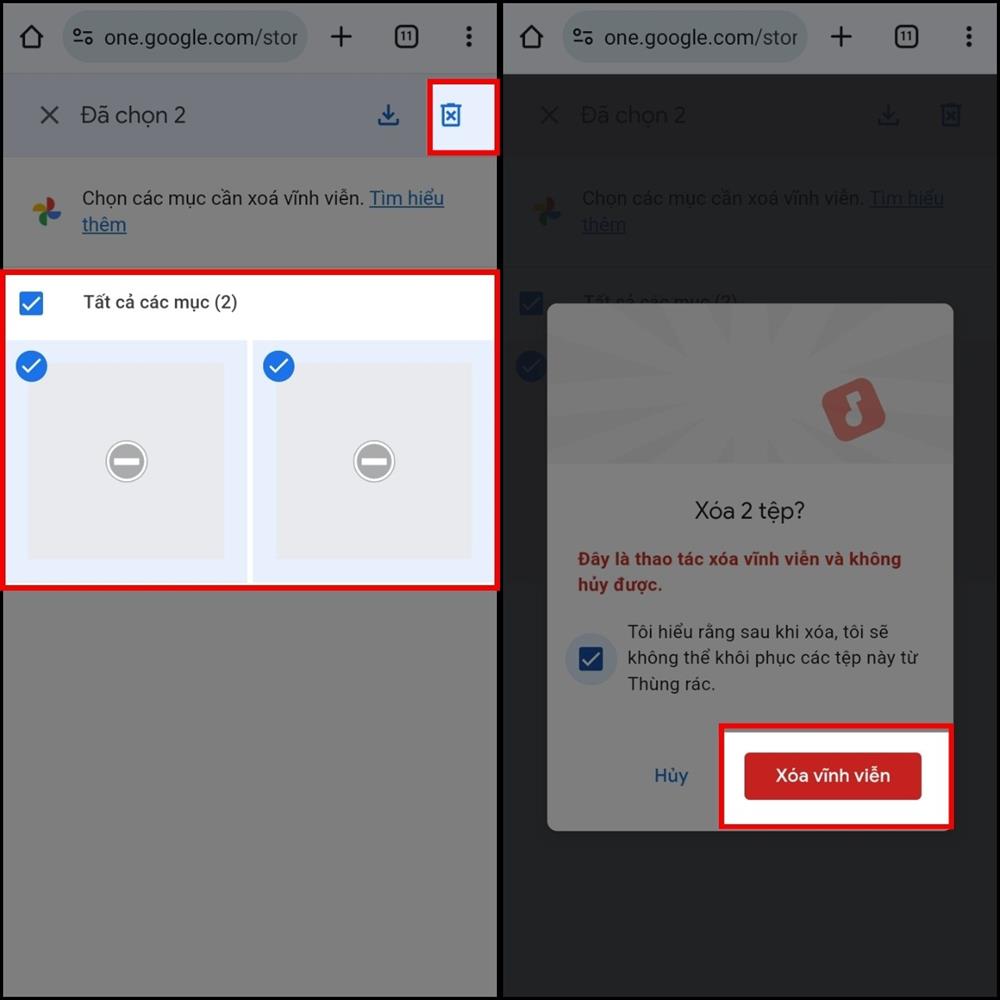 Bước 2: Tiếp tục, bạn kiểm tra và chọn Tất cả các mục cần xóa > Chọn biểu tượng Thùng rác ở góc bên phải để xóa > Xác nhận thao tác Xóa vĩnh viễn để xóa video.