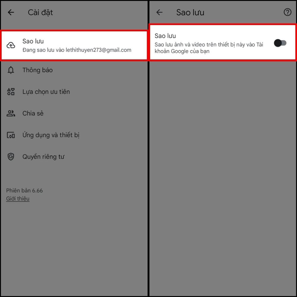 Nếu bạn thường xuyên sao lưu nội dung rác trên nhiều ứng dụng sẽ khiến cho dung lượng Google Photos bị quá tải. Để thực hiện việc tắt sao lưu hình ảnh trên Google Photos, bạn hãy truy cập vào phần Chế độ cài đặt của Photos > nhấn chọn Sao lưu > Tắt tính năng sao lưu ngay trên ứng dụng.
