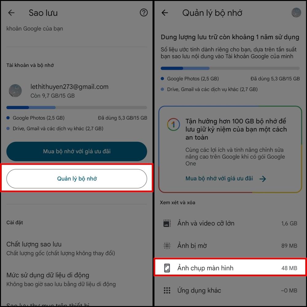 Bước 1: Đầu tiên bạn hãy truy cập vào mục Chế độ cài đặt của Photos > Chọn phần Sao lưu > Nhấn chọn Quản lý bộ nhớ > Chọn vào Ảnh chụp màn hình để tiến hành xóa.