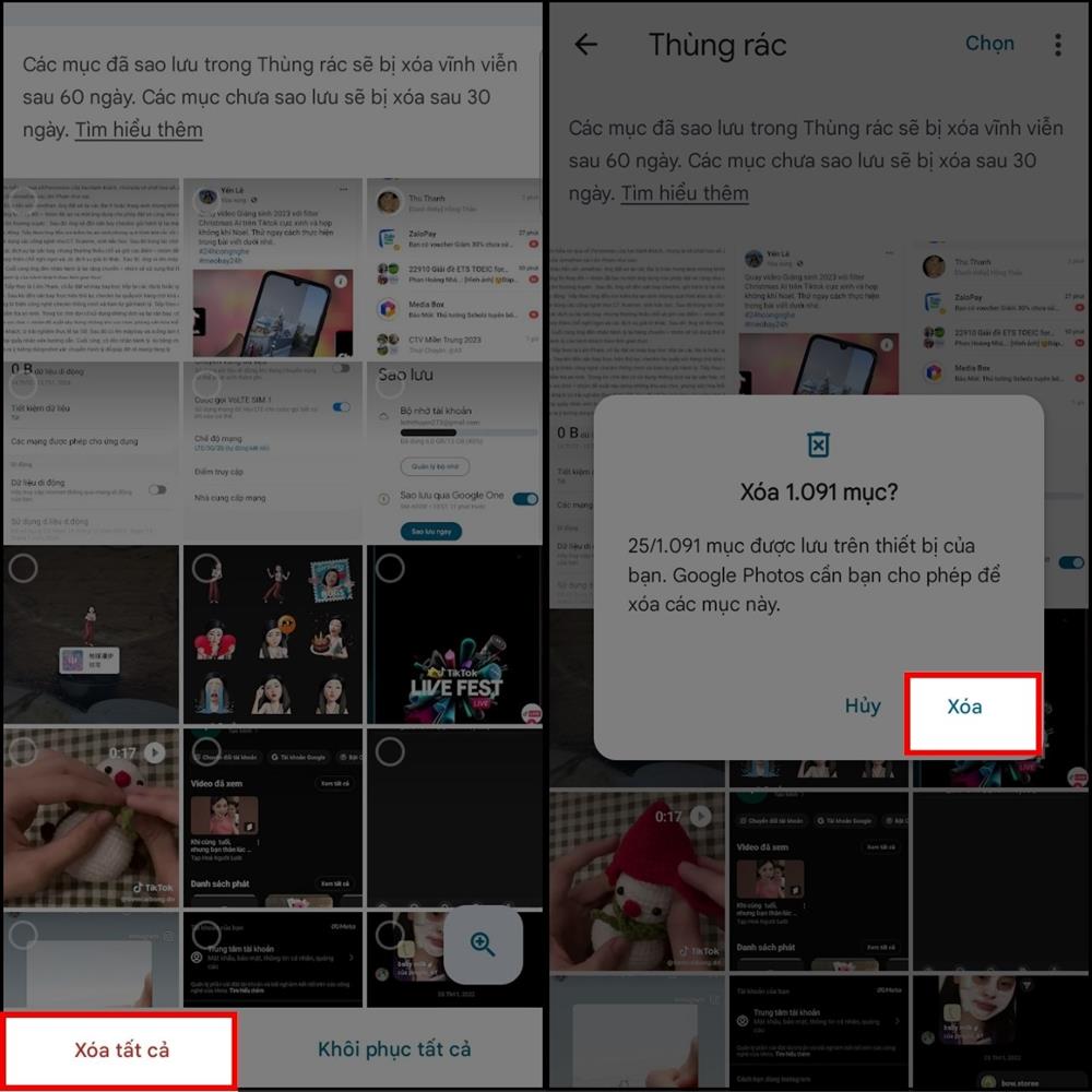 Bước 2: Sau khi chọn Tất cả hình ảnh trong thùng rác> Nhấn chọn Xóa tất cả để xóa vĩnh viễn khỏi ứng dụng > Xác nhận Xóa để hoàn thành.