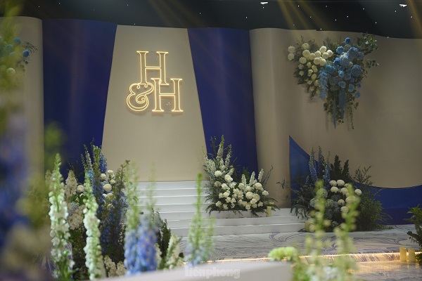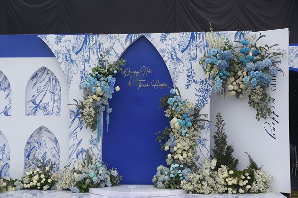 Bên trong rạp cưới được trang trí toàn bộ bằng hoa tươi.