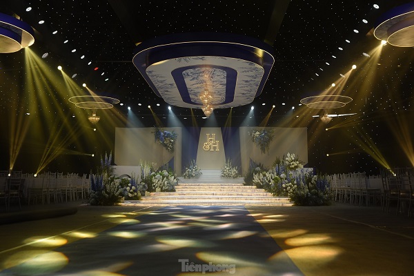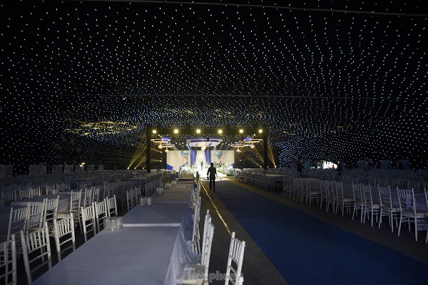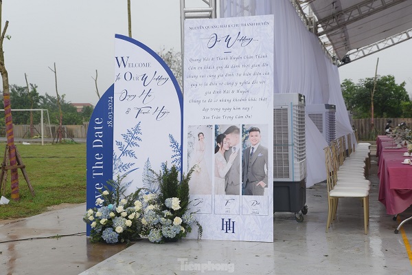 Từ sáng sớm, không khí chuẩn bị ở nhà trai tại Đông Anh đã rộn ràng. Rạp cưới được dựng trên sân vận động với diện tích khoảng 2.000 m2 đã hoàn thiện.