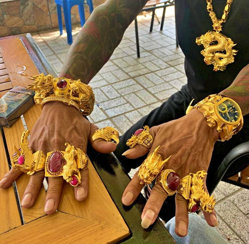 Mỗi món trang sức mà anh đeo đều có trọng lượng và được chạm khắc theo những họa tiết khác nhau.