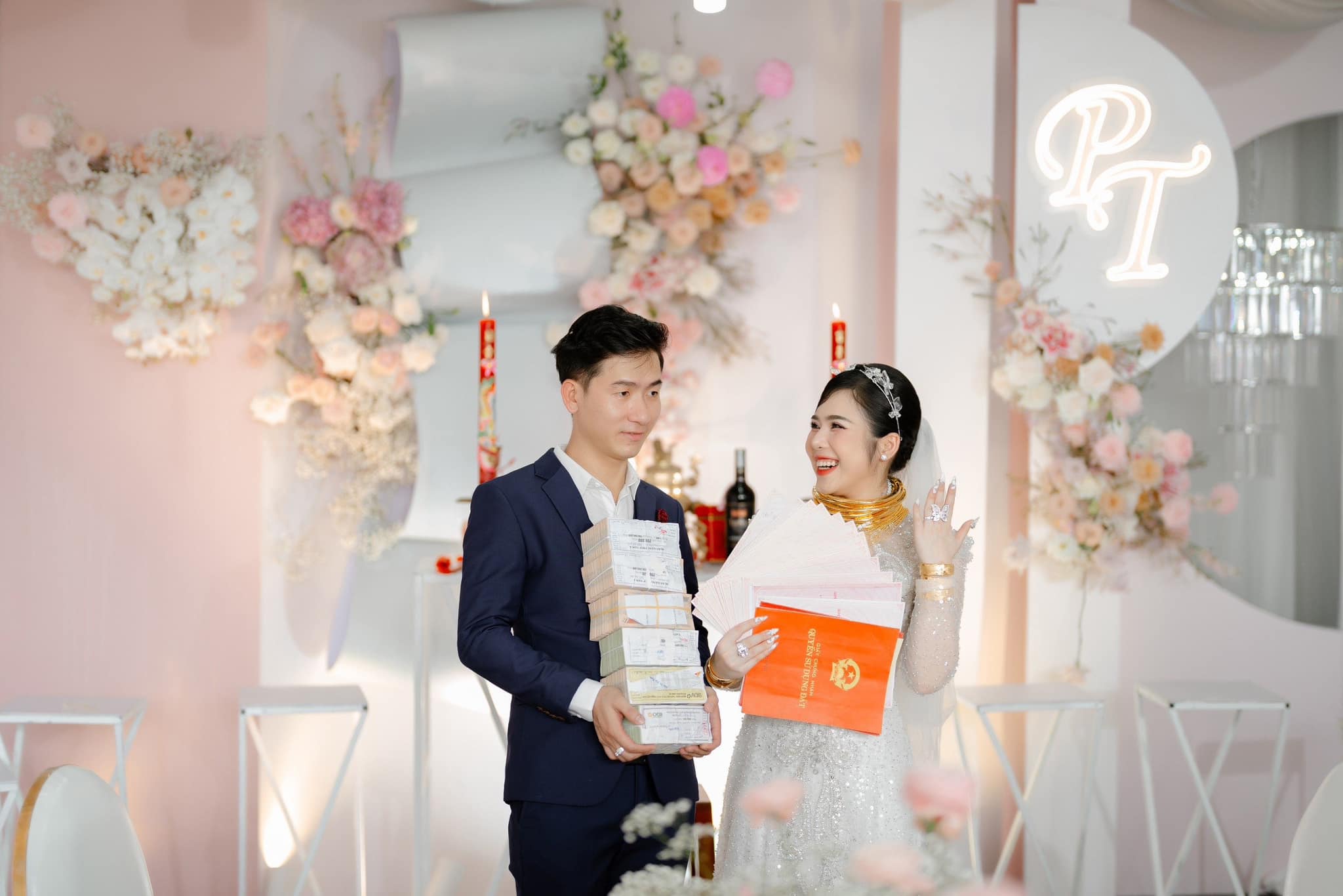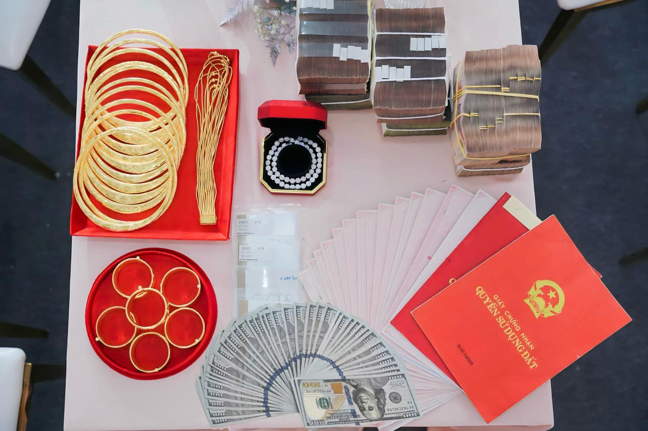 Cô dâu cho biết tổng số quà cưới hai vợ chồng nhận được gồm: chừng 25 cây vàng, 1.5 tỷ đồng do nhà chồng trao tặng, 1 tỷ đồng cho bố mẹ đẻ dành tặng và 16 cuốn sổ đỏ do hai bên gia đình làm vốn làm ăn, thêm 7.000 đô la và một dây chuyền kim cương do dòng họ và hai em tặng.