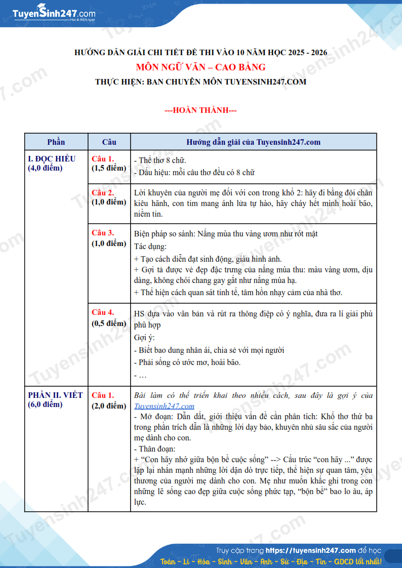 Đáp án Đề thi môn Văn vào lớp 10 Cao Bằng 2025
