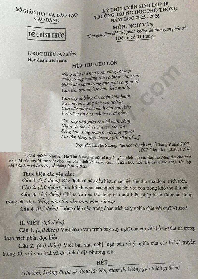 Đề thi môn Văn vào lớp 10 Cao Bằng 2025