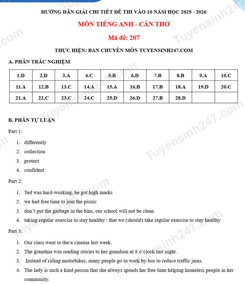 Đáp án đề thi vào lớp 10 năm 2025 môn Tiếng Anh tại Cần Thơ. Nguồn ảnh: tuyensinh247