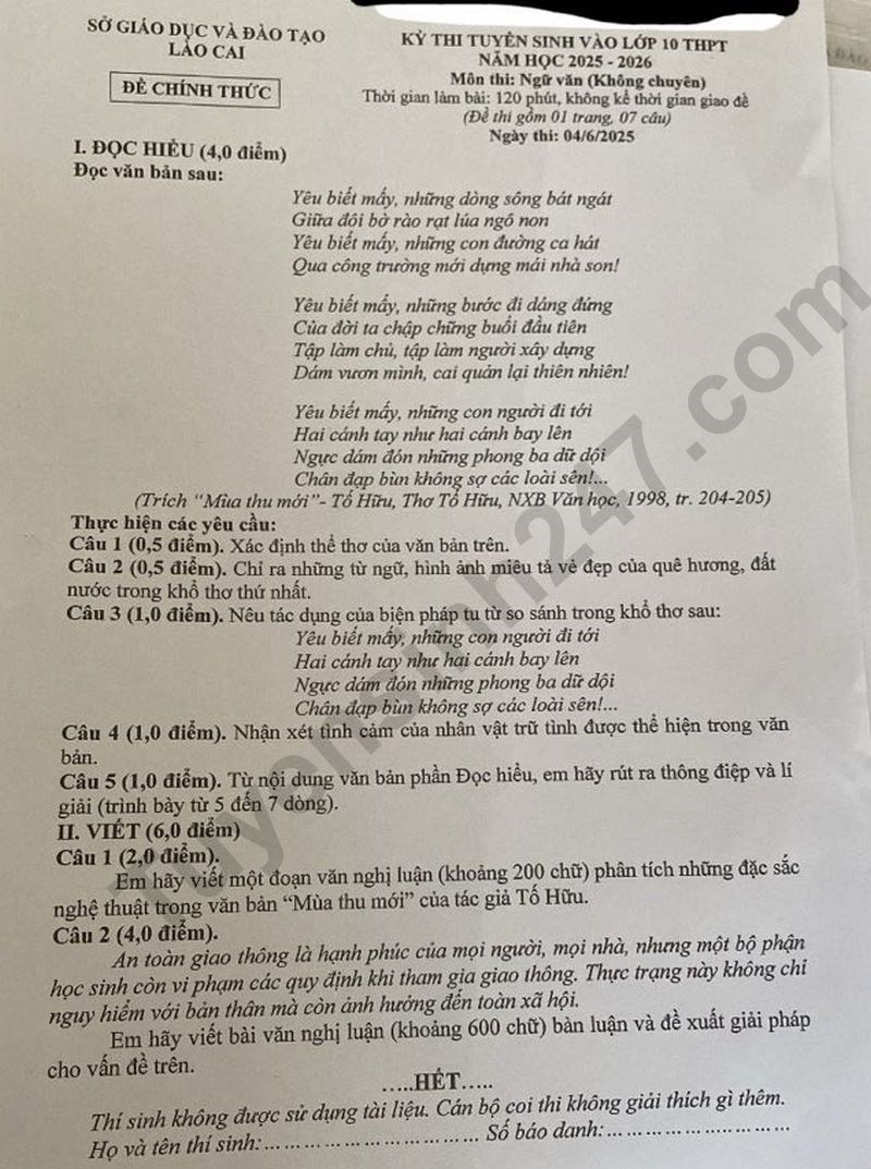 Đề thi vào lớp 10 năm 2025 môn Văn tại Lào Cai. Nguồn ảnh: tuyensinh247