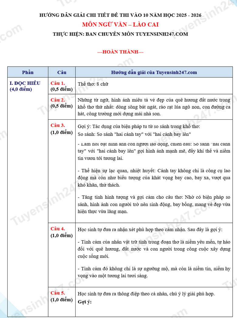 Đáp án đề thi vào lớp 10 năm 2025 môn Văn tại Lào Cai. Nguồn ảnh: tuyensinh247