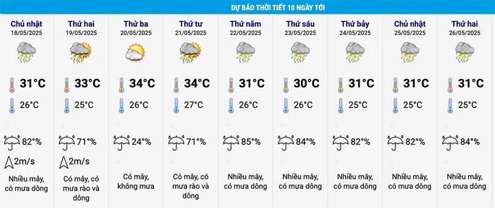 Tuy nhiên, hình thái thời tiết này không duy trì được lâu. Từ ngày 20-26/5, Hà Nội phổ biến mưa dông, nhiệt độ cao nhất giảm về ngưỡng 30-31°C, thấp nhất duy trì 25-26°C.