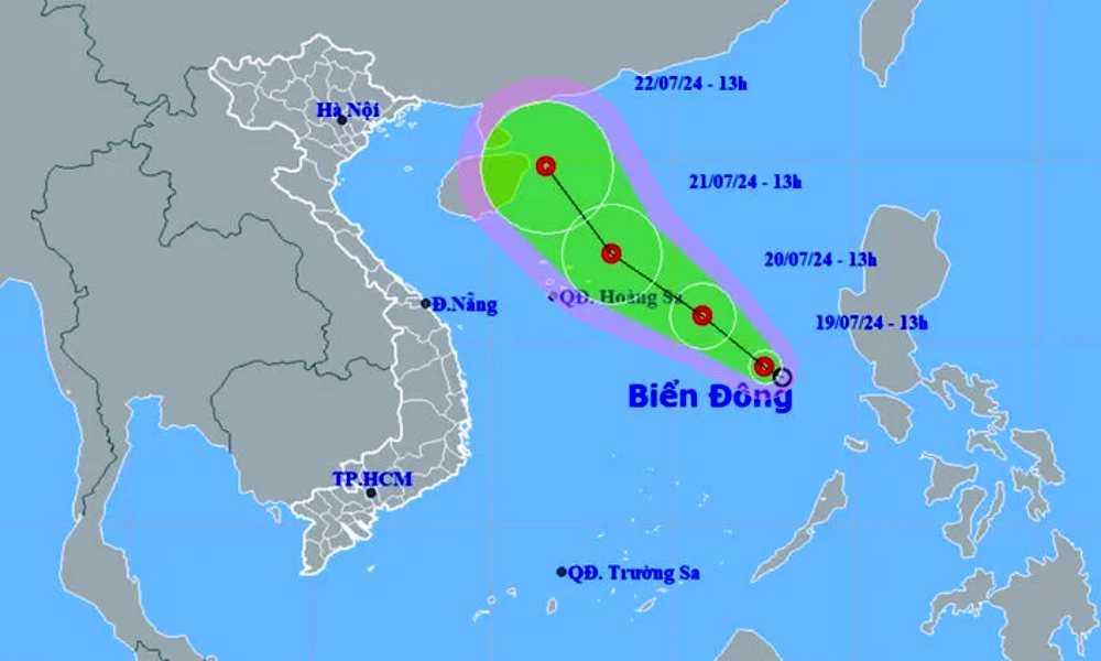 Lúc 13h ngày 19/7, áp thấp nhiệt đới trên vùng biển phía Đông của khu vực giữa Biển Đông. Sức gió mạnh nhất vùng gần tâm áp thấp nhiệt đới mạnh cấp 6 (39-49km/h), giật cấp 8, di chuyển theo hướng Tây Bắc với tốc độ 5-10km/h.