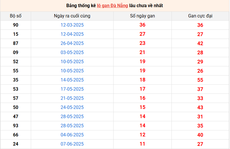Bảng thống kê lô gan Đà Nẵng lâu về nhất 16/7/2025