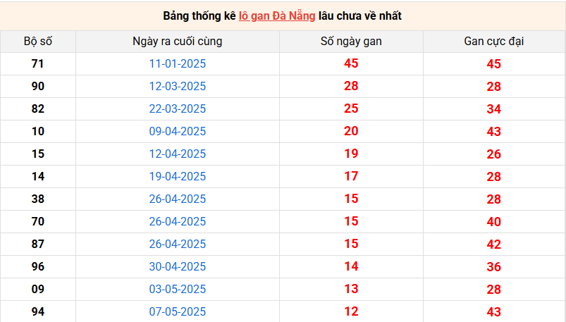 Bảng thống kê lô gan Đà Nẵng lâu về nhất 21/6/2025