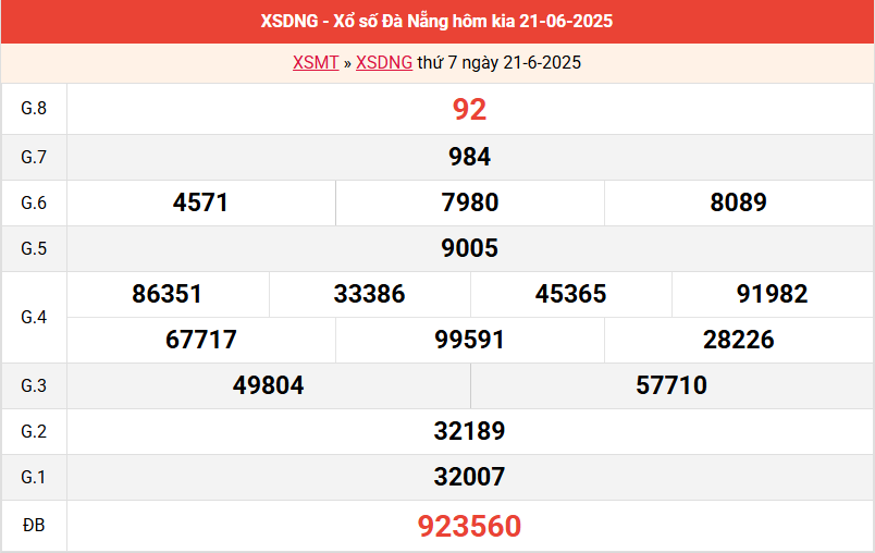 Bảng kết quả XSDNG ngày 21/6/2025 tuần trước