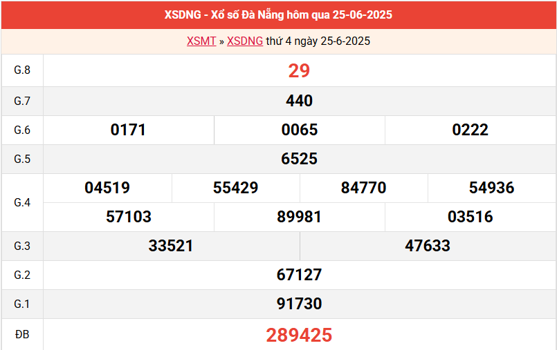 Bảng kết quả Đà Nẵng ngày 25/6/2025 tuần trước