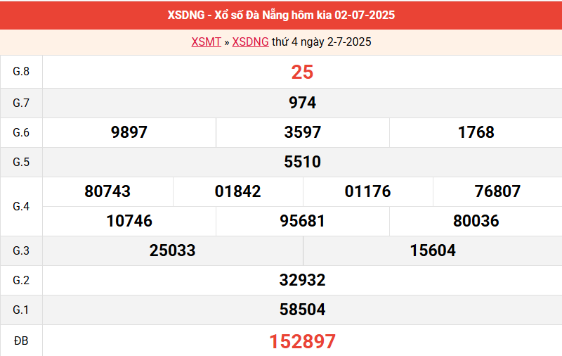 Bảng kết quả Đà Nẵng ngày 02/7/2025 tuần trước