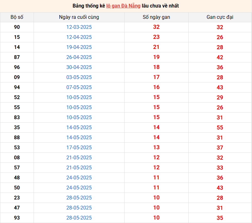 Bảng thống kê lô gan Đà Nẵng lâu về nhất 05/7/2025