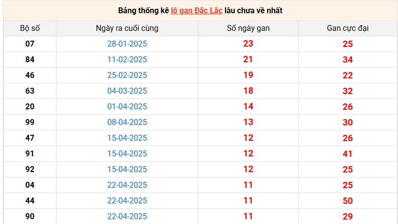 Bảng thống kê lô gan Đắk Lắk lâu về nhất 15/7/2025