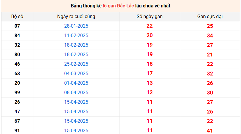 Bảng thống kê lô gan Đắk Lắk lâu về nhất 08/7/2025