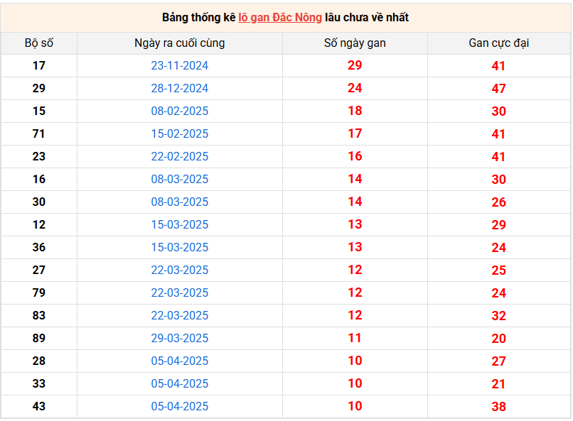 Bảng thống kê lô gan Đắc Nông lâu về nhất 21/6/2025
