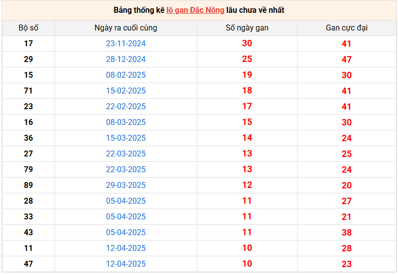 Bảng thống kê lô gan Đắc Nông lâu về nhất 28/6/2025