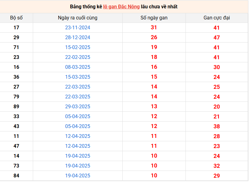Bảng thống kê lô gan Đắc Nông lâu về nhất 05/7/2025