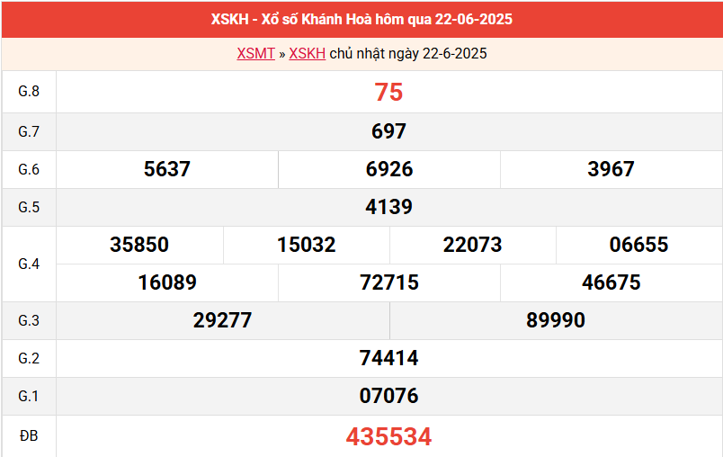 Mời các bạn xem lại bảng kết quả kỳ trước với giải đặc biệt, giải tám, lô tô 2 số để có thể đưa ra nhận định dự đoán KH ngày 25 tháng 6 năm 2025 chuẩn xác nhất.