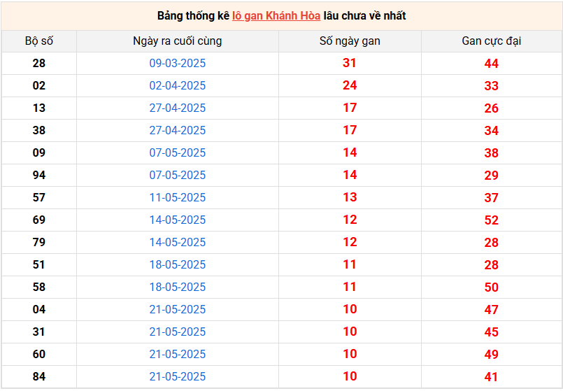 Bảng lô gan Khánh Hòa lâu về nhất 29/6/2025