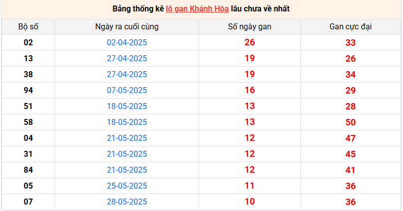 Bảng lô gan Khánh Hòa lâu về nhất 06/7/2025