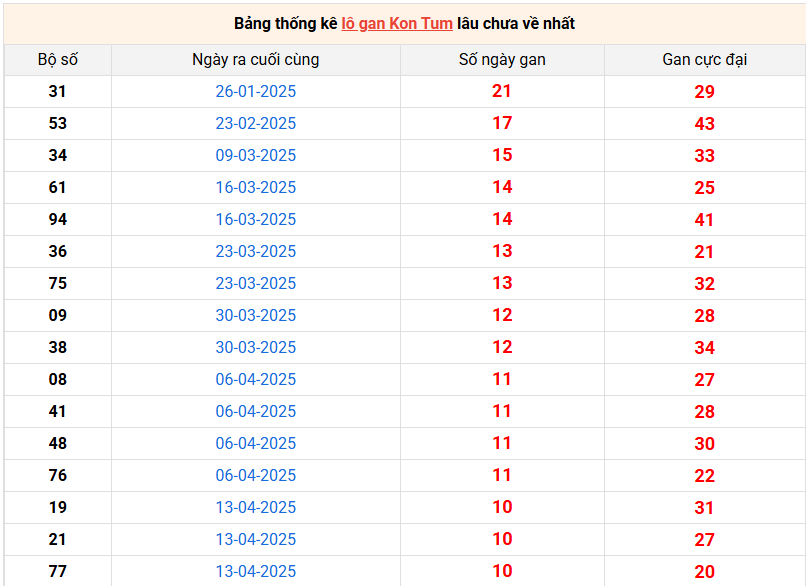 Bảng thống kê lô gan Kon Tum lâu về nhất 29/6/2025