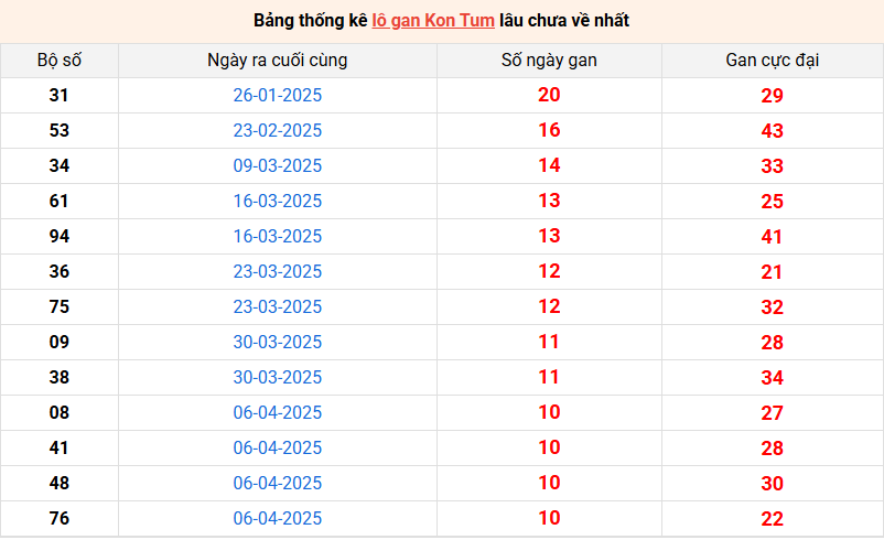 Bảng thống kê lô gan Kon Tum lâu về nhất 22/6/2025
