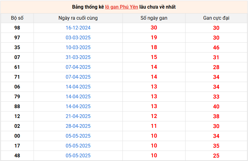 Bảng thống kê lô gan Phú Yên lâu về nhất 21/7/2025
