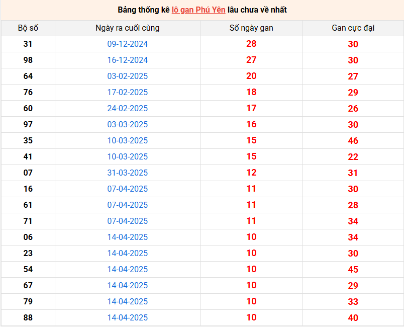 Bảng thống kê lô gan Phú Yên lâu về nhất 30/6/2025