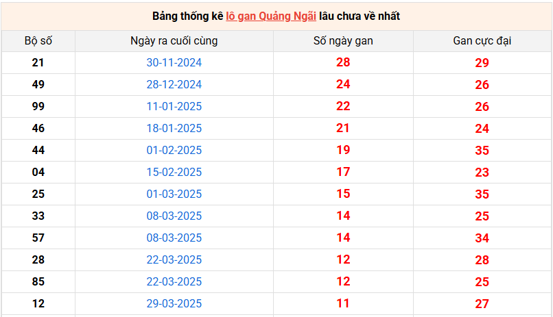 Bảng thống kê lô gan Quảng Ngãi lâu về nhất 21/6/2025