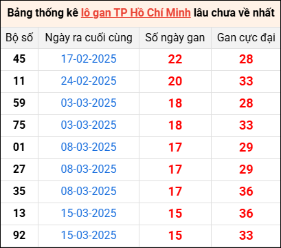 Bảng thống kê lô gan Hồ Chí Minh lâu về nhất 10/5/2025