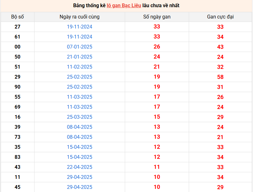 Bảng thống kê lô gan Bạc Liêu lâu về nhất 15/7/2025