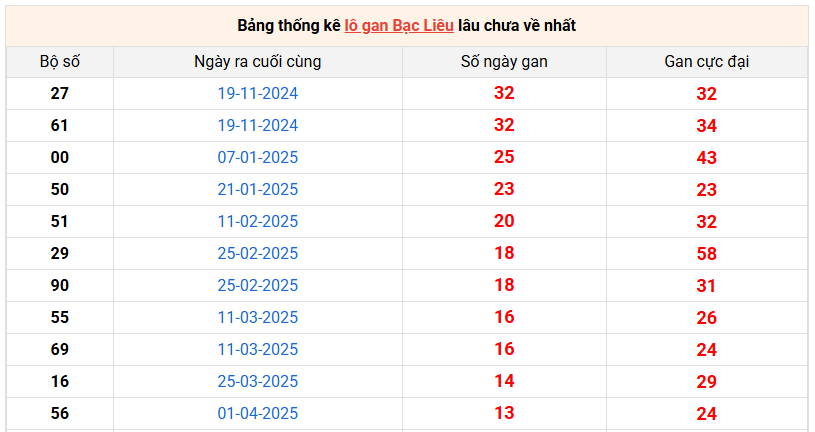 Bảng thống kê lô gan Bạc Liêu lâu về nhất 8/7/2025